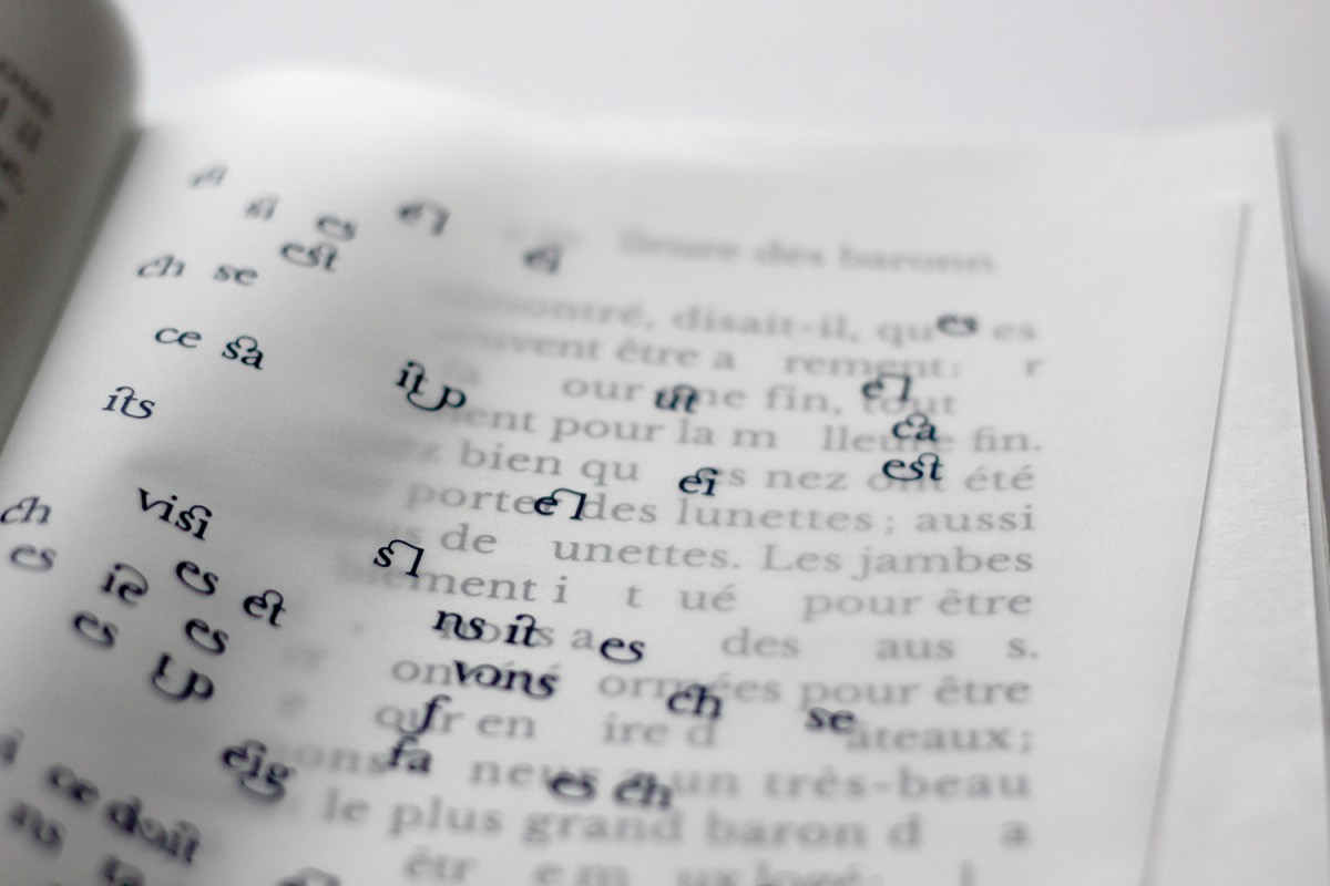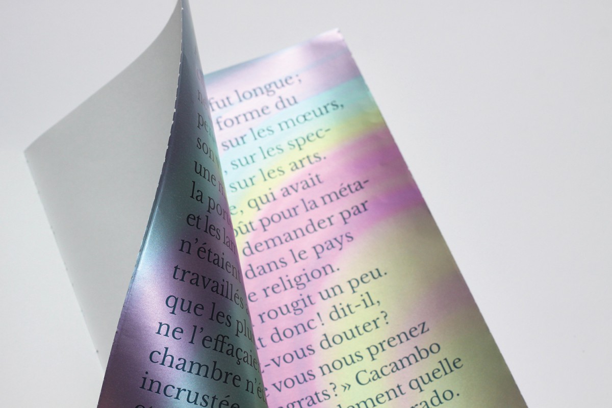 Le livre a été construit sur l’analogie entre l’aventure de Candide et l’expérience du lecteur, son parcours dans le livre, en articulant le travail autour de la progression narrative du récit. Les ligatures soulignent l’aspect factice de son monde d’origine. La typographie s’altère au gré des épreuves que traverse le personnage. Le « meilleur des monde possibles », dont il entretient la chimère, est caché dans le revers du livre, comme un univers parallèle inaccessible.