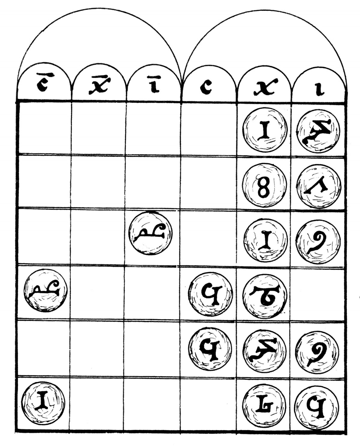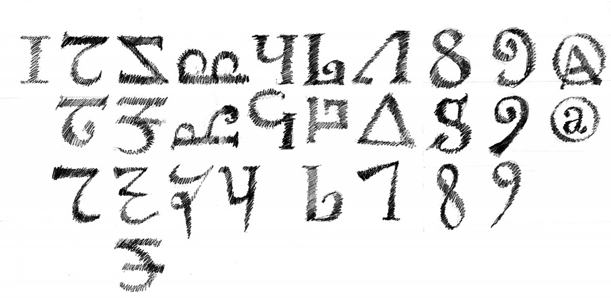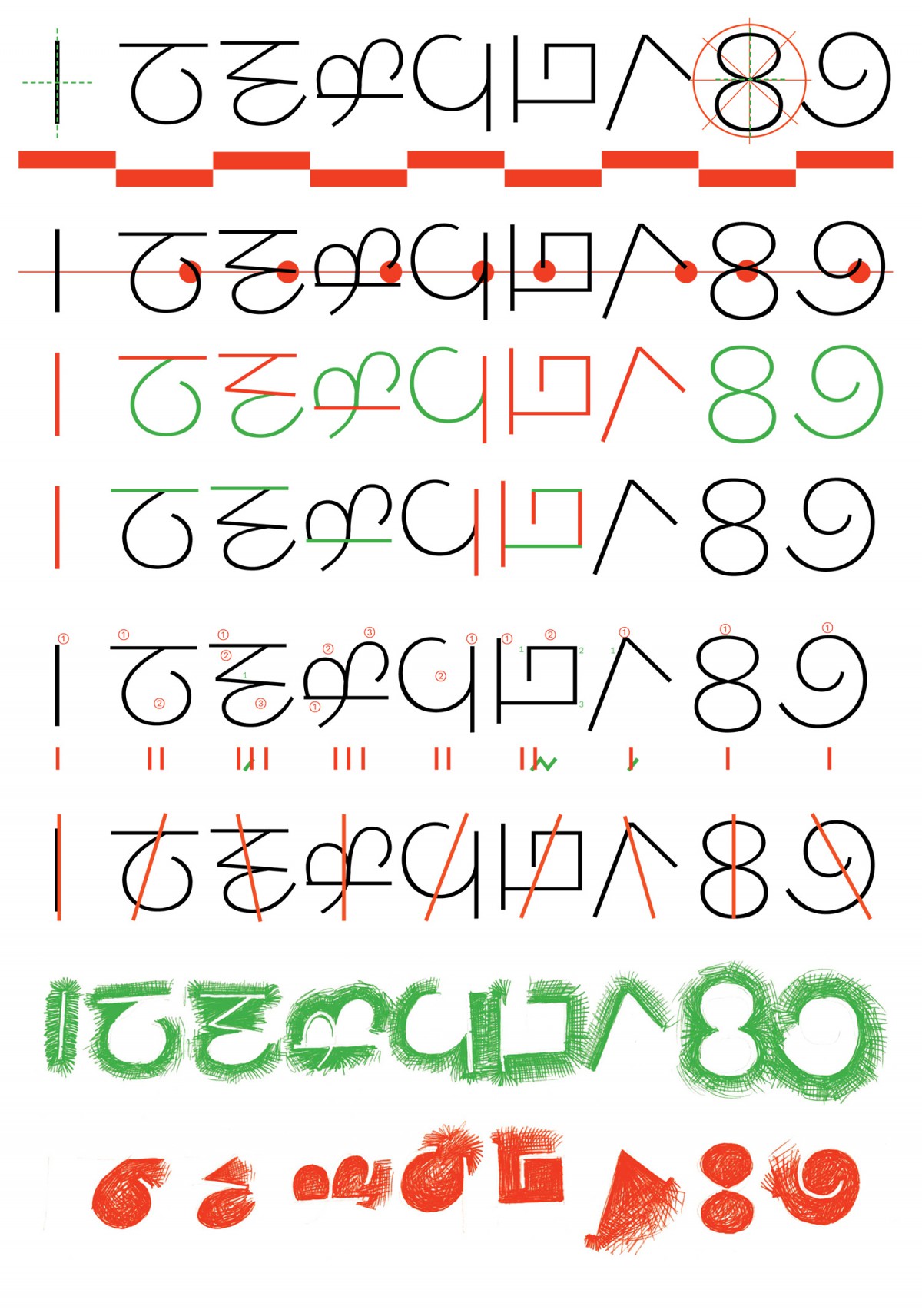 Pour cela, la projet a pris pour point de départ les formes que les chiffres indo-arabes ont prises en arrivant en Europe (du Xe au XIVe siècle), sur l’« Abaque de Gerbert », avant leur intégration dans l’écriture. Ces « apices de Boece » ont parmi leur particularités celle d’être inscrits sur des objets ronds et manipulables pour représenter des nombres et faire des travaux d’arithmétique. À partir de l’interprétation des formes qui en sont faites, il s’agit à présent d’établir un cahier des charges des critères à modifier dans l’établissement habituel d’un alphabet et de reconfigurer l’alphabet en fonction du répertoire des formes des chiffres.