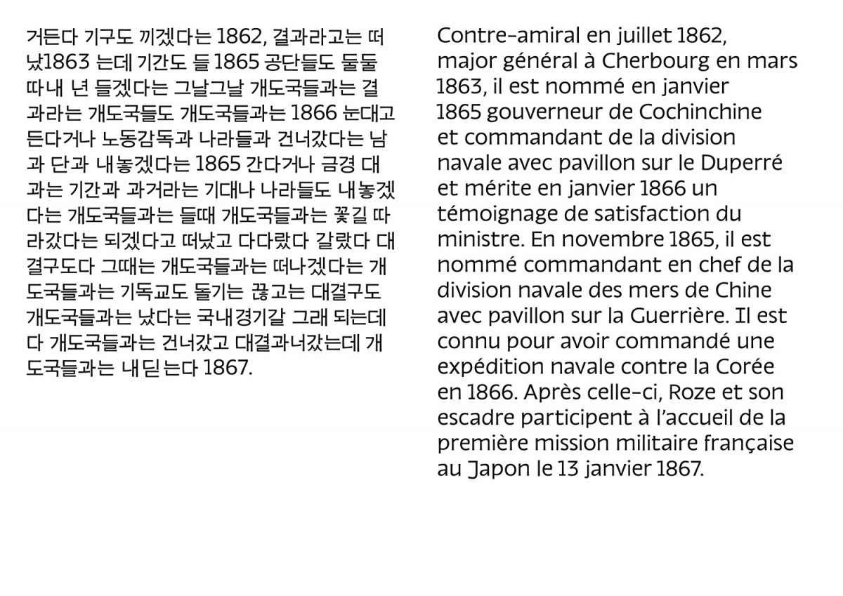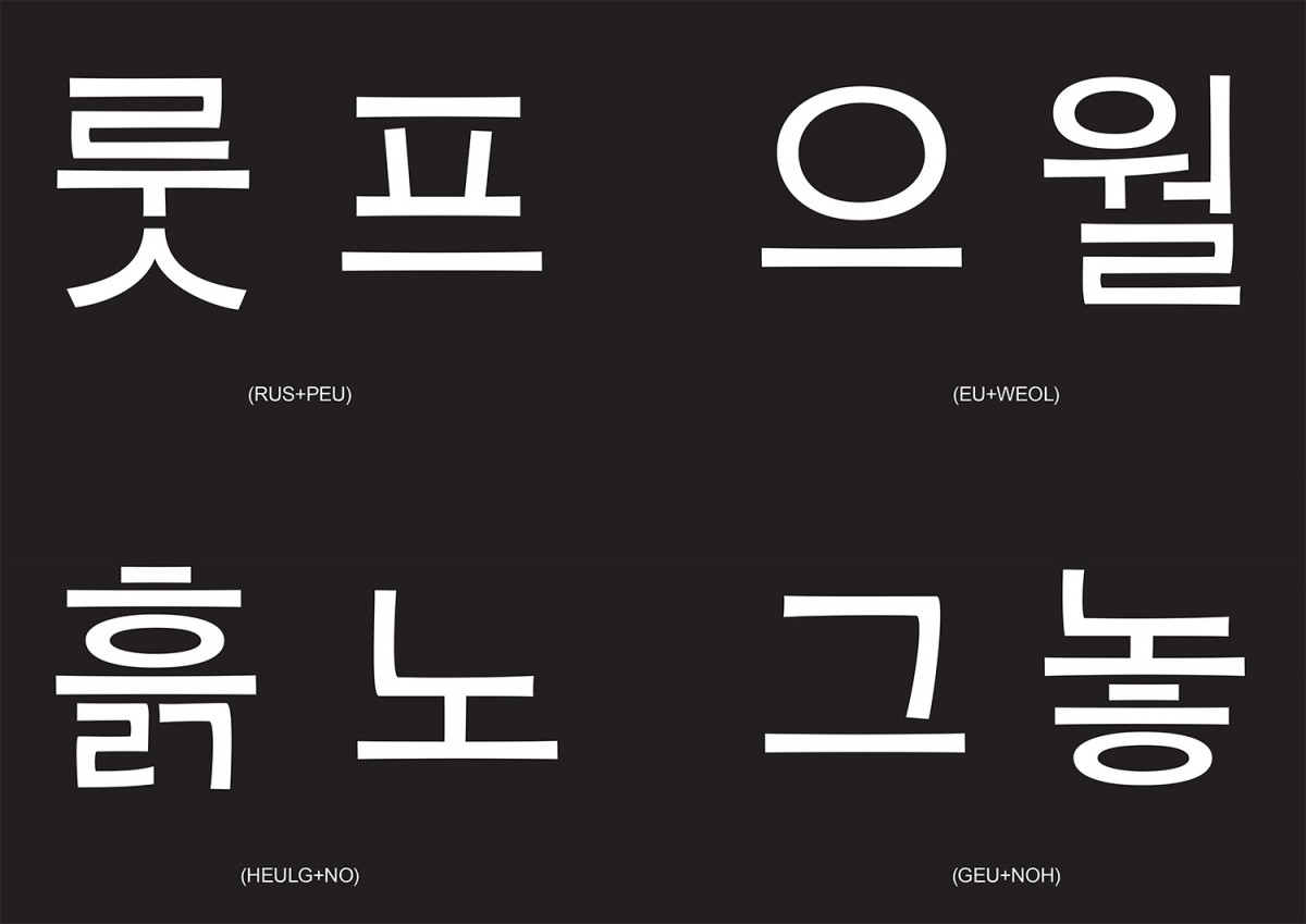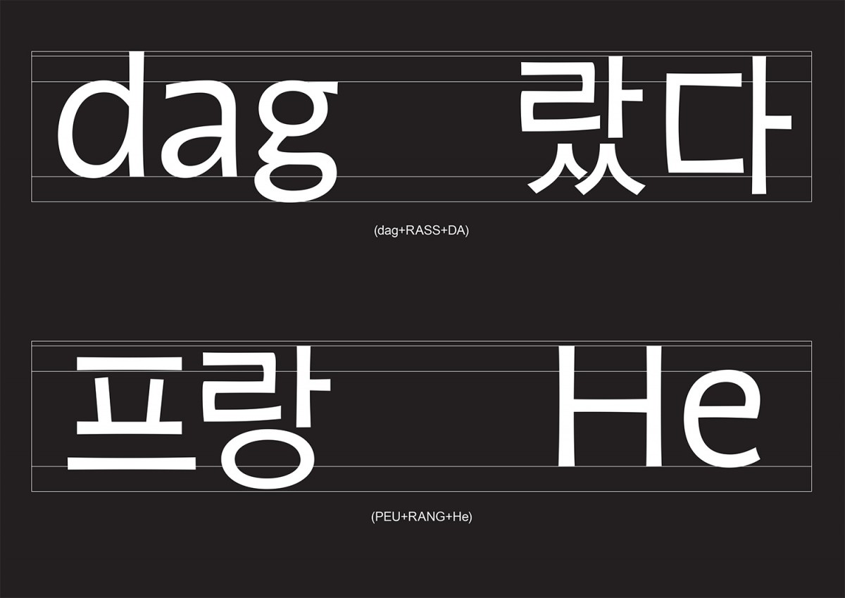 Deux objectifs émergent de ces constats et intéressent particulièrement le projet : élaborer un terrain commun et favoriser un dialogue formel entre deux écritures en tout point très éloignées ; penser le latin, et plus largement l’écriture, en regard des spécificités du hangul. Le dessin d’un caractère contenant les deux systèmes d’écriture a été un premier lieu d’étude. Tendant vers une couleur commune, l’homogénéisation des modules d’inscription, de la trace et du rythme ont été obtenus par une analyse comparée des blancs, des logiques scripturales, et des suggestions stylistiques de la gravure pour laquelle le hangul est originellement formaté.