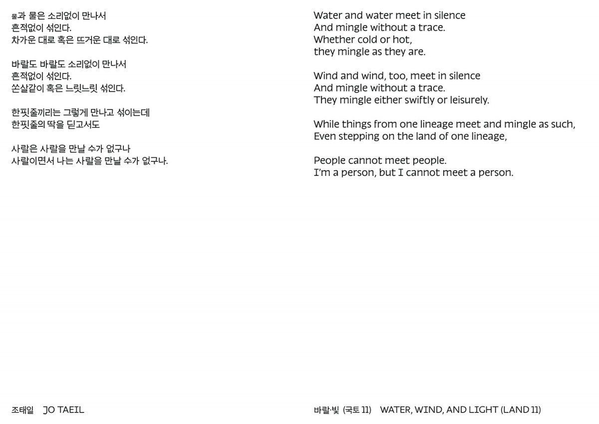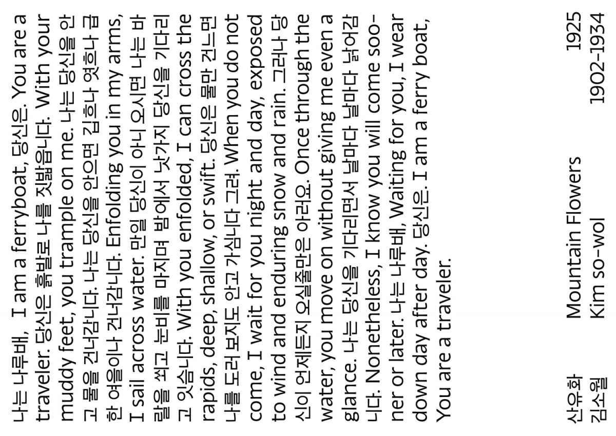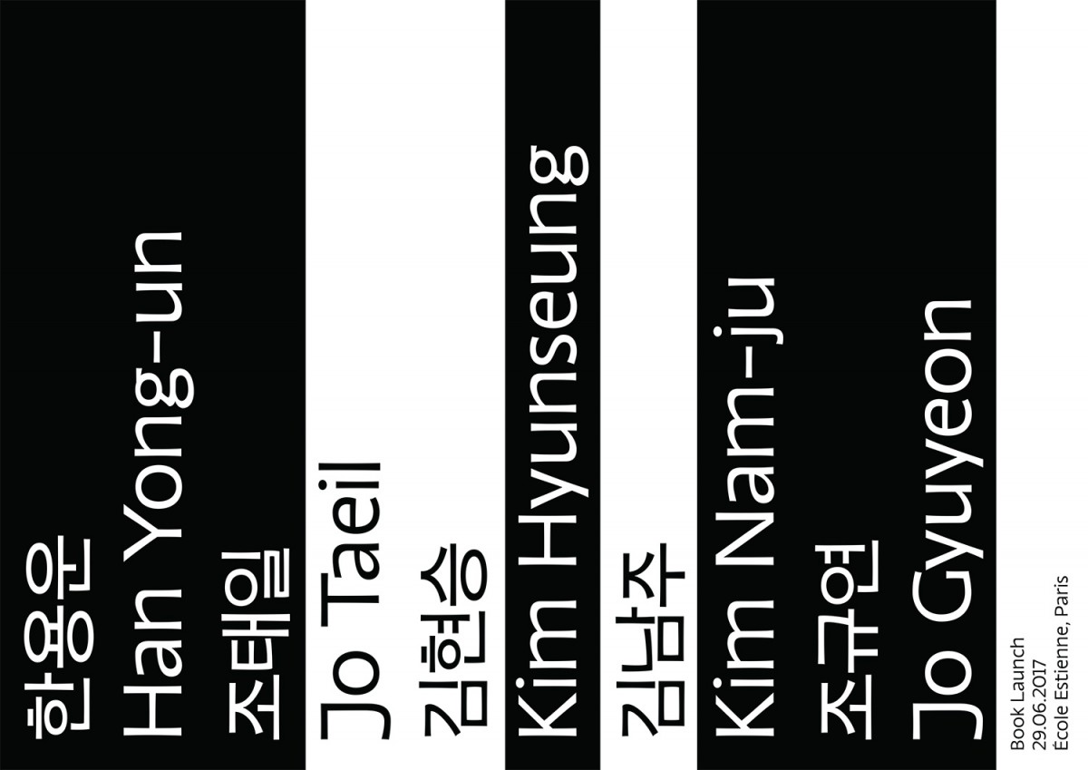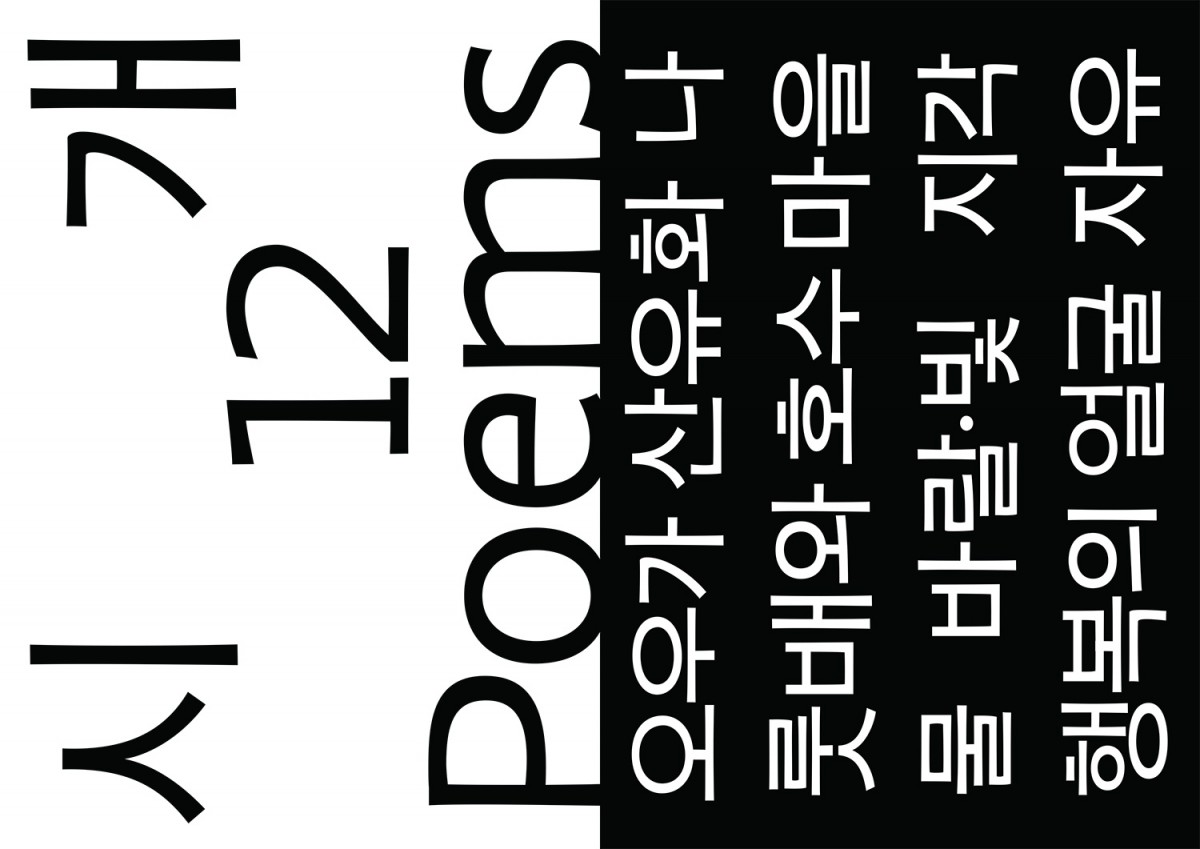 Deux objectifs émergent de ces constats et intéressent particulièrement le projet : élaborer un terrain commun et favoriser un dialogue formel entre deux écritures en tout point très éloignées ; penser le latin, et plus largement l’écriture, en regard des spécificités du hangul. Le dessin d’un caractère contenant les deux systèmes d’écriture a été un premier lieu d’étude. Tendant vers une couleur commune, l’homogénéisation des modules d’inscription, de la trace et du rythme ont été obtenus par une analyse comparée des blancs, des logiques scripturales, et des suggestions stylistiques de la gravure pour laquelle le hangul est originellement formaté.