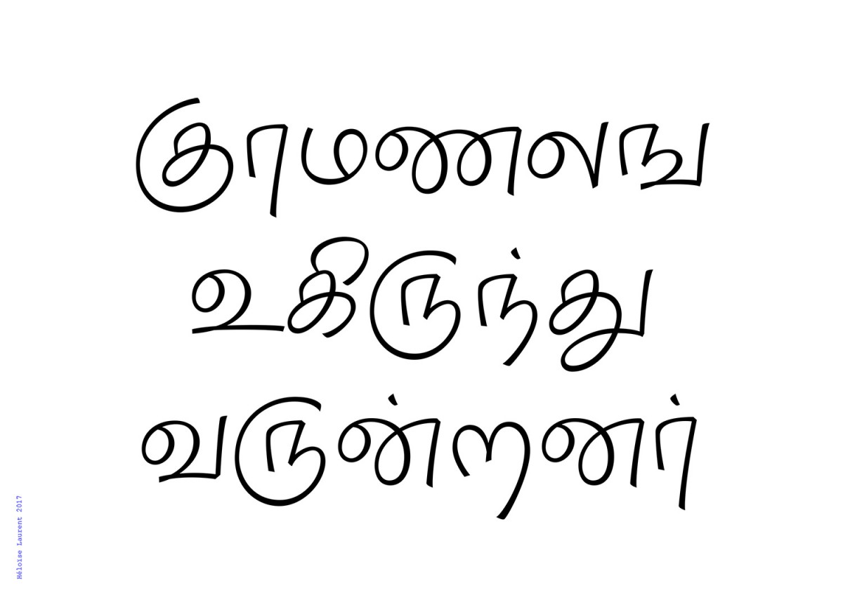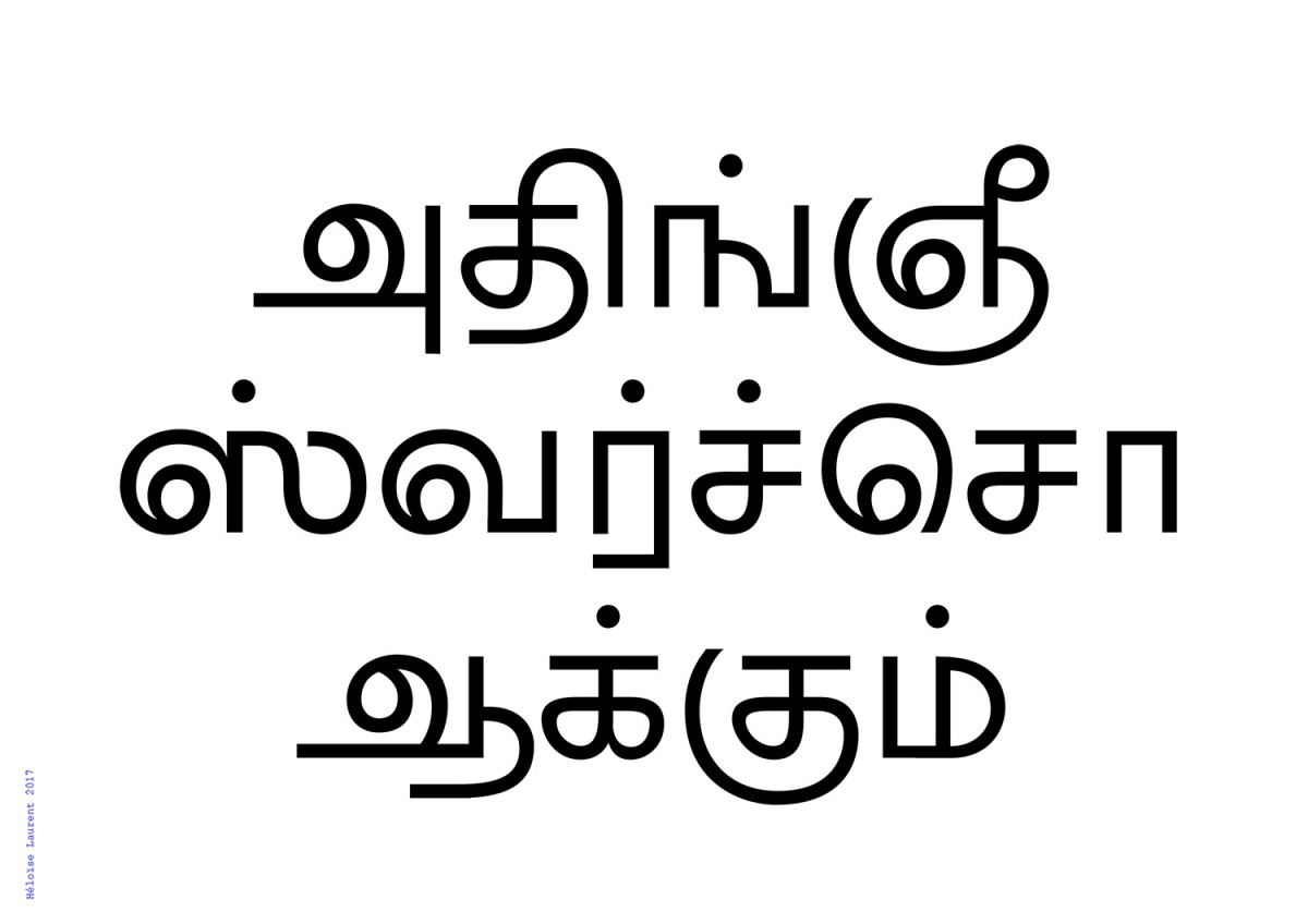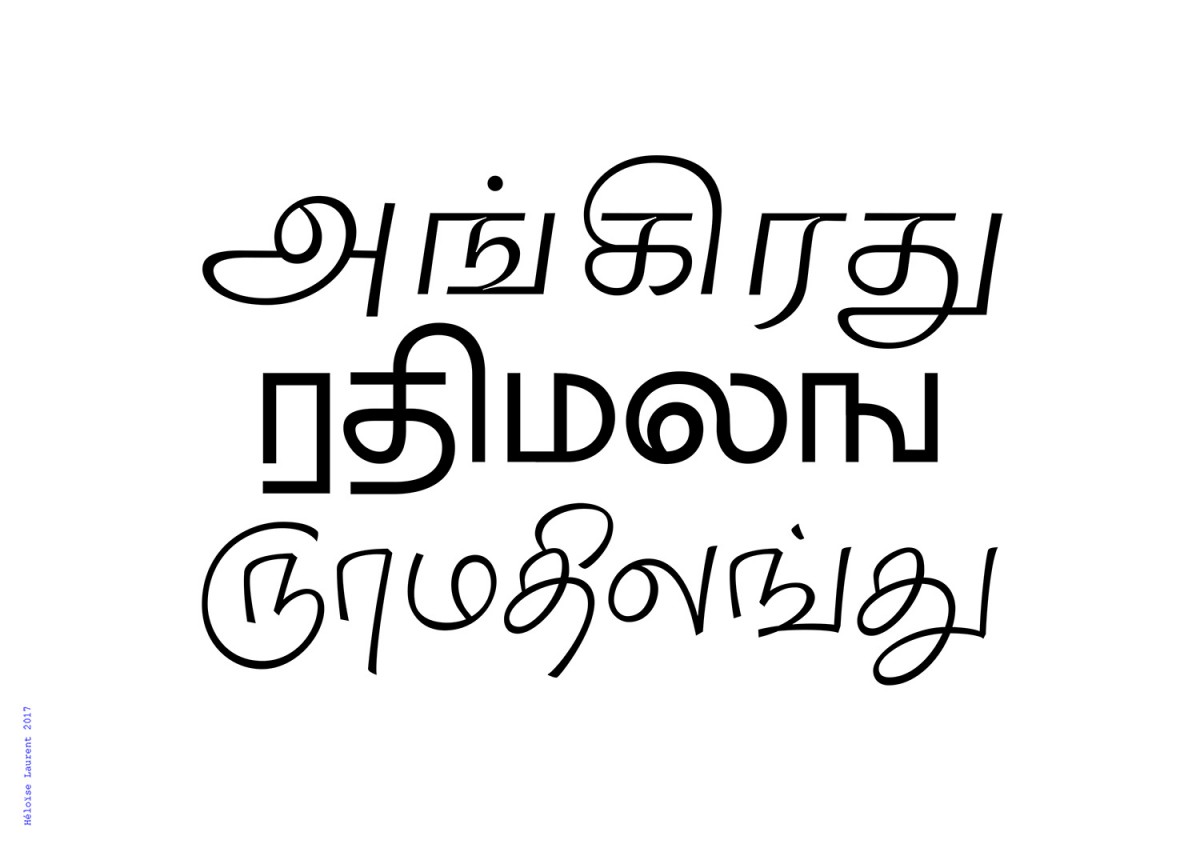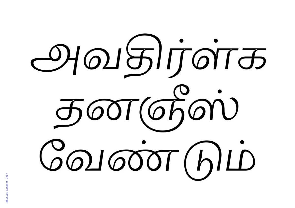 Les écritures régionales du Sud de l’Inde sont nombreuses, diverses et massivement utilisées, pourtant elles n’ont que très peu de développement typographique et quasi aucune visibilité à l’internationale. Elle sont fragiles face à l’utilisation croissante de l’alphabet latin et sont davantage susceptibles d’en emprunter l’esthétique culturelle car elle n’ont pas de tradition calligraphique. Ce projet expérimente l’écriture tamoule (région du Tamil Nadu, Sri Lanka), dont la pauvreté typographique est à la fois quantitative et qualitative, et ce malgré une culture visuelle riche et polymorphe. Existe t-il en tamoul la même élasticité, malléabilité des signes qu’en écriture latine ? Le tamoul étant strictement linéaire, est-il possible d’apposer d’autres logiques formelles, moins restrictives, comme par la masse, ou la vitesse ?
