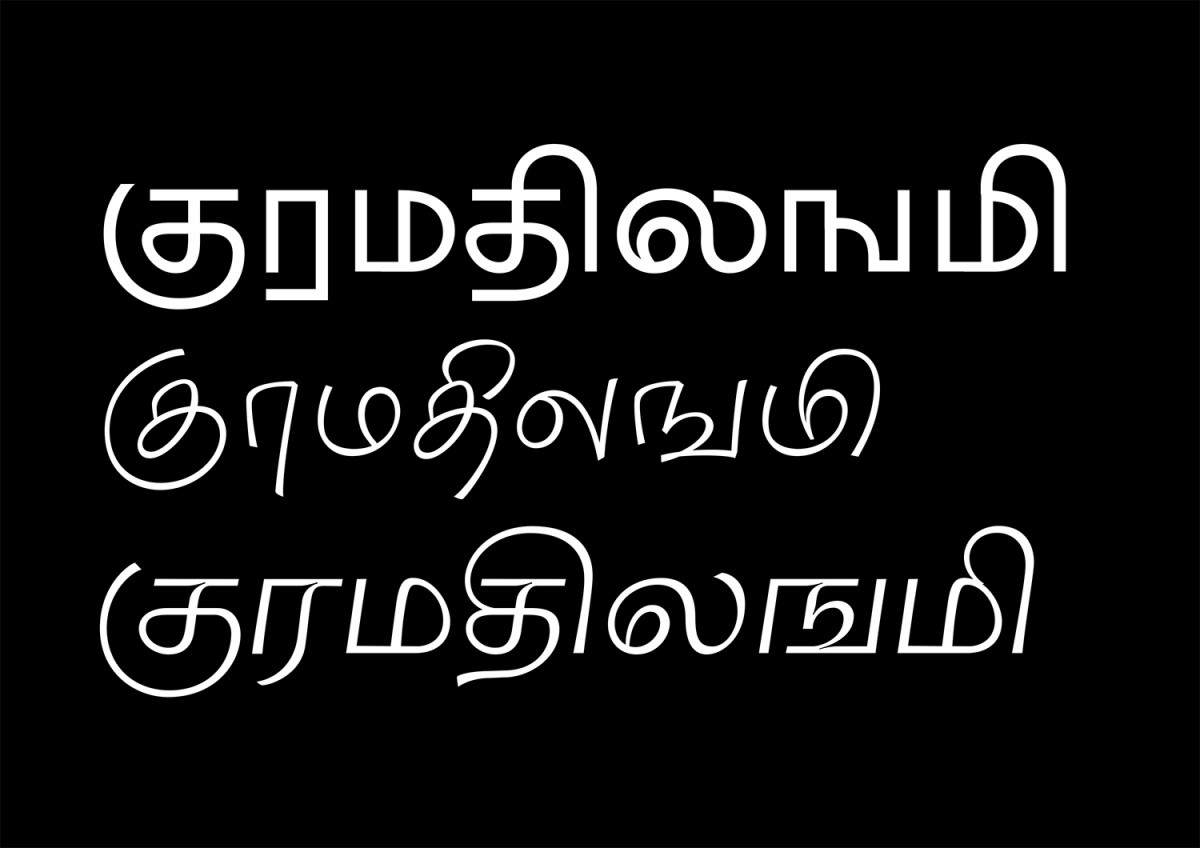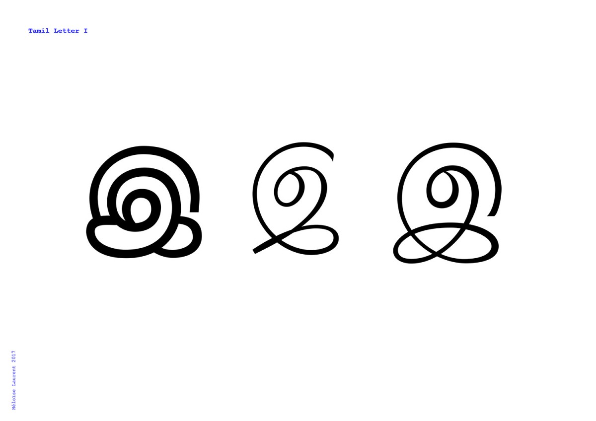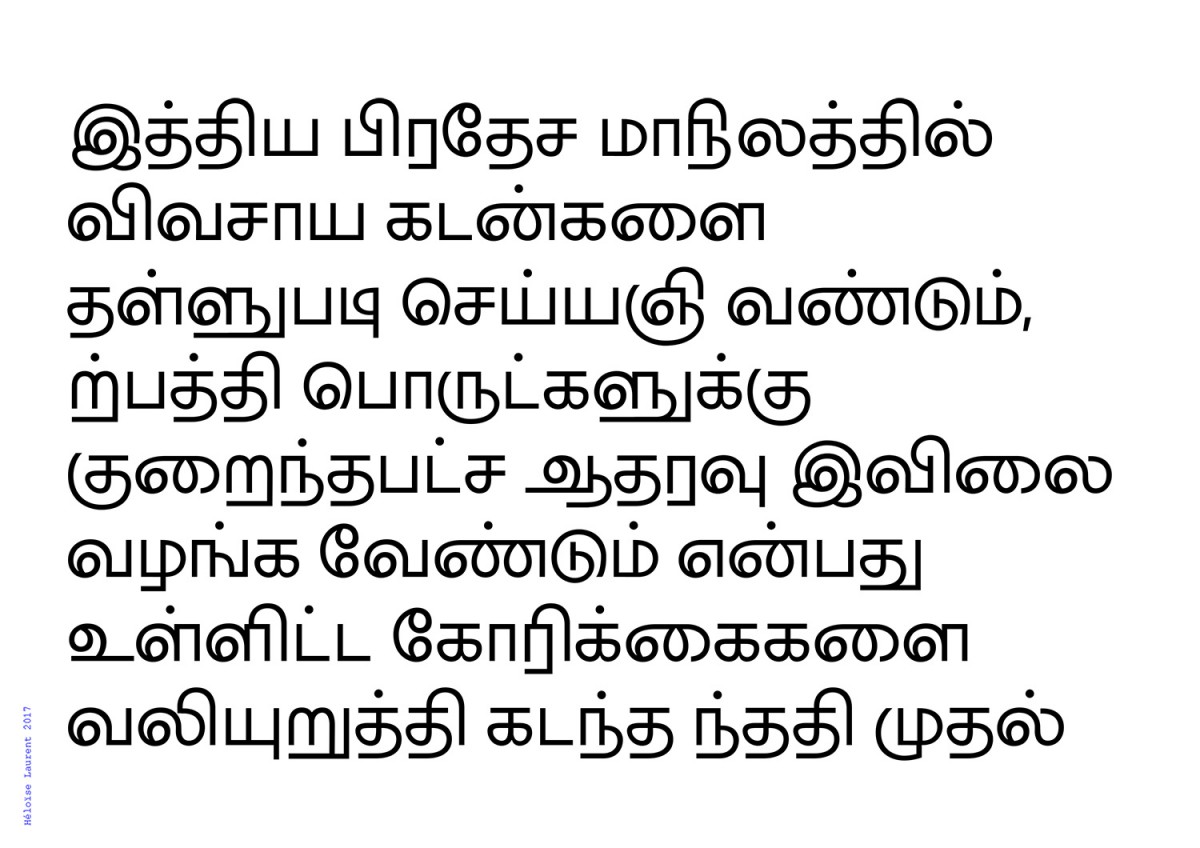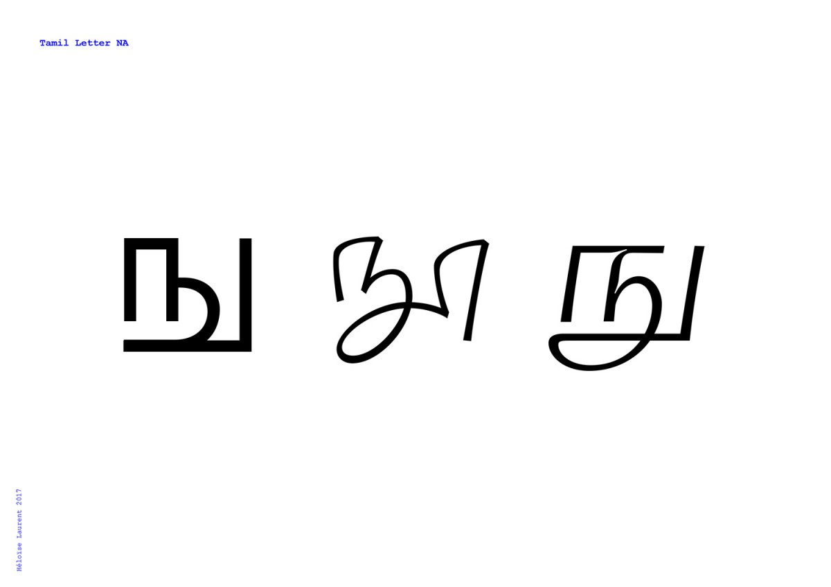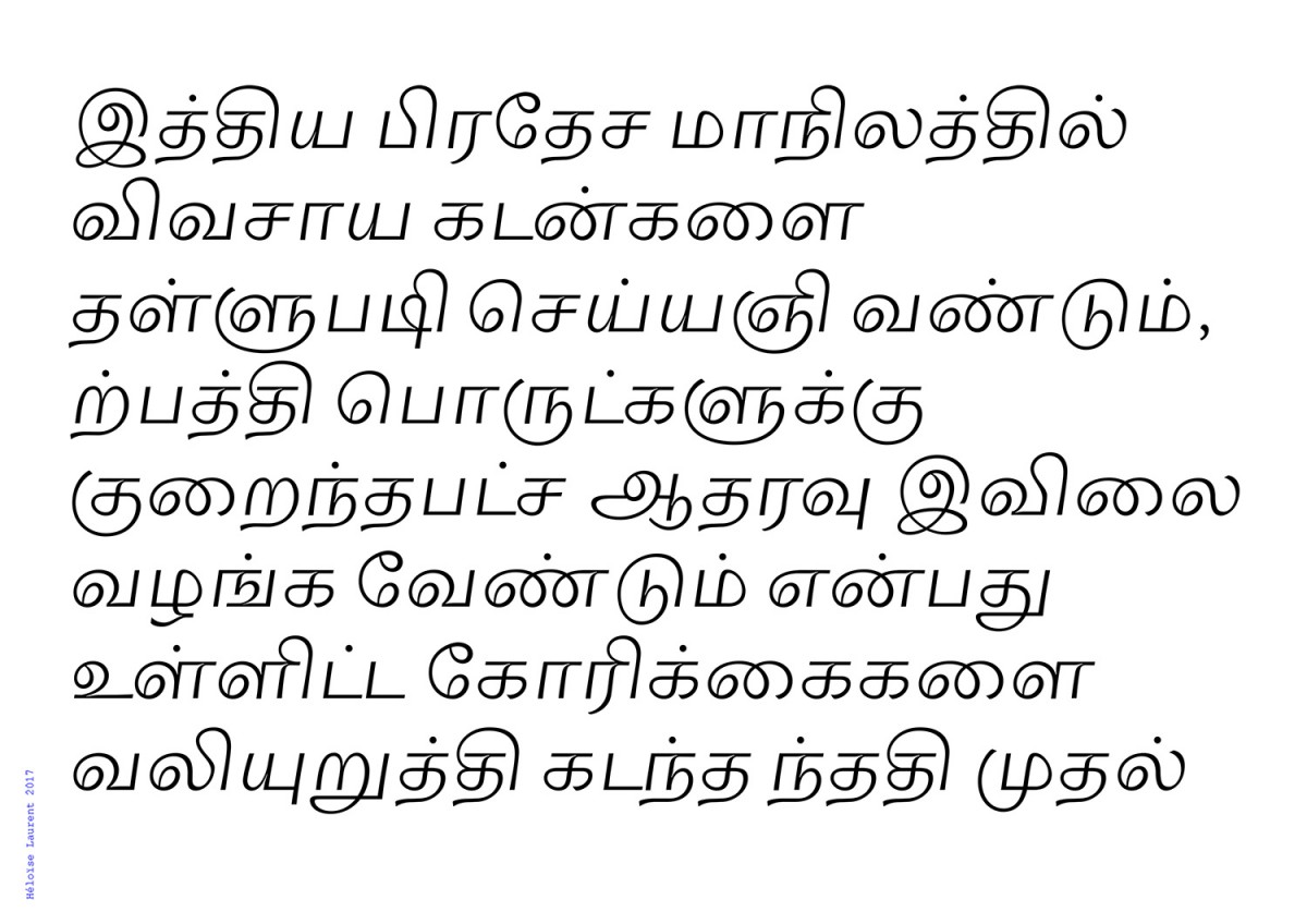 Les écritures régionales du Sud de l’Inde sont nombreuses, diverses et massivement utilisées, pourtant elles n’ont que très peu de développement typographique et quasi aucune visibilité à l’internationale. Elle sont fragiles face à l’utilisation croissante de l’alphabet latin et sont davantage susceptibles d’en emprunter l’esthétique culturelle car elle n’ont pas de tradition calligraphique. Ce projet expérimente l’écriture tamoule (région du Tamil Nadu, Sri Lanka), dont la pauvreté typographique est à la fois quantitative et qualitative, et ce malgré une culture visuelle riche et polymorphe. Existe t-il en tamoul la même élasticité, malléabilité des signes qu’en écriture latine ? Le tamoul étant strictement linéaire, est-il possible d’apposer d’autres logiques formelles, moins restrictives, comme par la masse, ou la vitesse ?