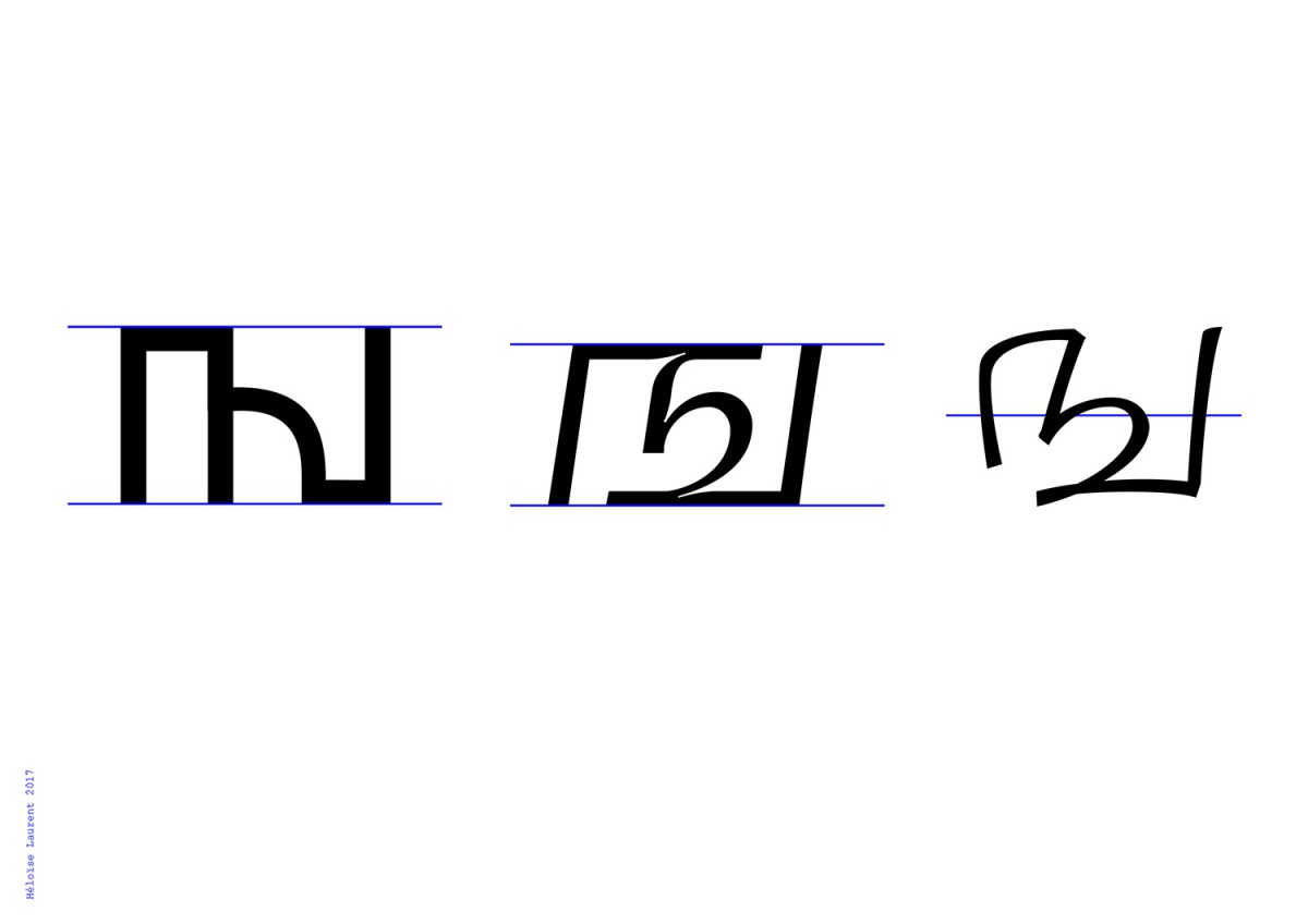 Ces trois caractères démontrent une gymnastique de la lisibilité, entre un extrême dessiné (logique de structuration typographique, forme synthétique) et un extrême écrit (logique linéaire, soumis au geste et à sa vitesse, forme scripte). Le caractère intermédiaire, de labeur classique, a subit une intervention de détail afin de conserver ses caractéristiques fonctionnelles. Sa forme est didactique, et montre la façon la plus normale, maitrisée et controlé de tracer l’écriture.Sans présupposer d’usage précis, ces trois fontes on été harmonisées pour fonctionner ensemble, comme outils de hiérarchisation par exemple.