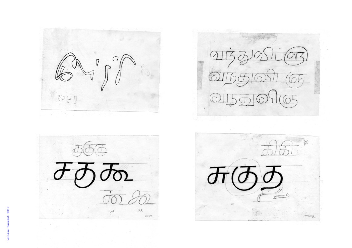 La recherche et l’investigation a été une partie importante du projet, afin notamment d’éviter d’apposer un regard fantasmé ou exotique sur cette culture très différente. Les sources choisies sont délibérément vernaculaires (échantillons d’écritures quotidienne, peintures d’enseignes, graphisme local), et appuyés par des immersions sur place, consultations d’archives, dialogue régulier avec locuteurs tamouls, analyses morphologiques, historiques, constitution d’une base de données, etc.