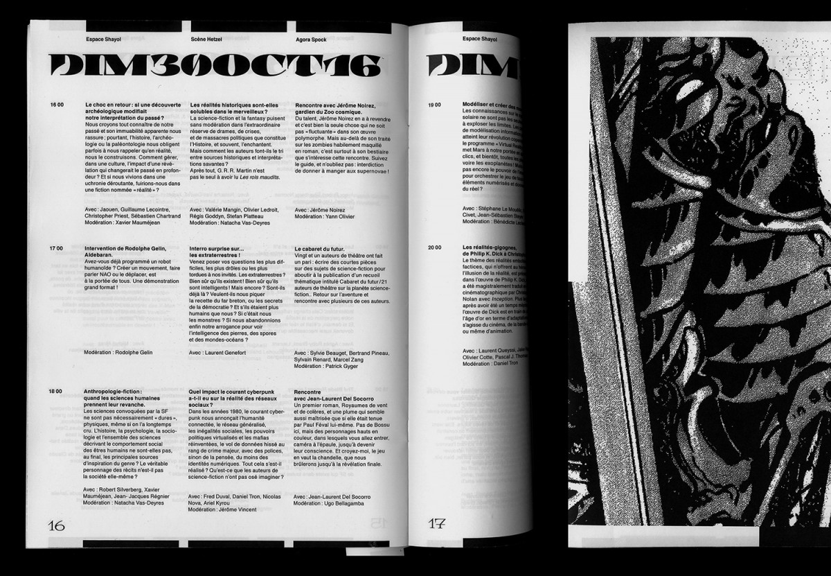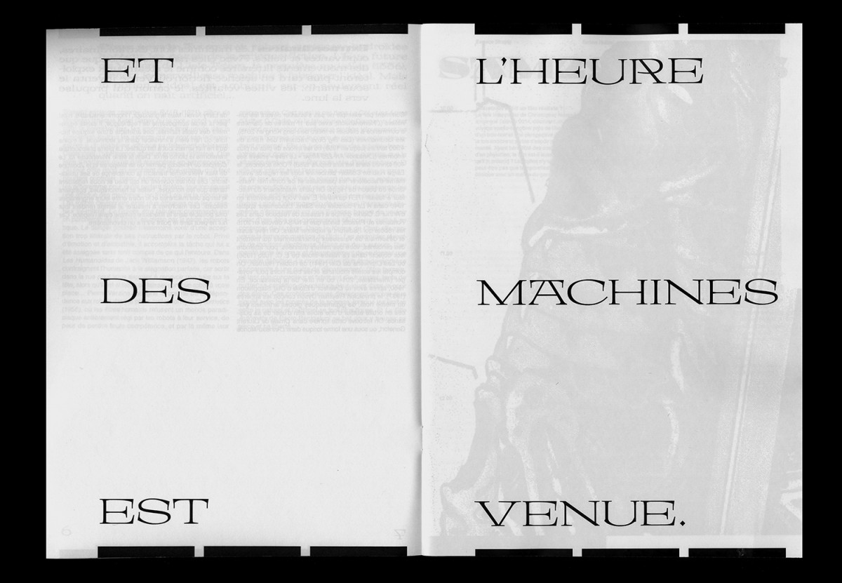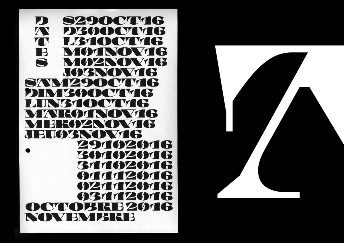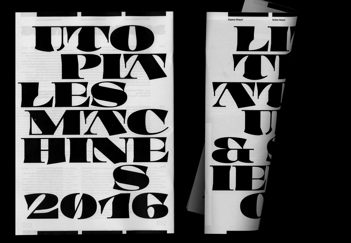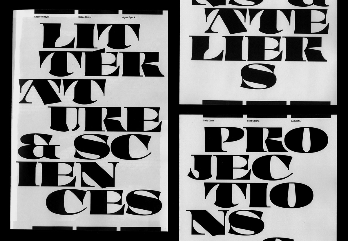 Le caractère gras, quant à lui, nous télescope au XIXeme siècle —époque de Jules Vernes, père de la science-fiction contemporaine et Nantais— en faisant écho aux lettres Normandes. Pensé comme un réceptacle, il est capable d’accueillir au même titre que la grille des images et des matières, de les recouvrir aussi, et de dessiner des mondes emboîtés dans l’interlettrage plus que dans la contreforme. Taillé mécaniquement, il fait apparaître le jour entre les lettres.